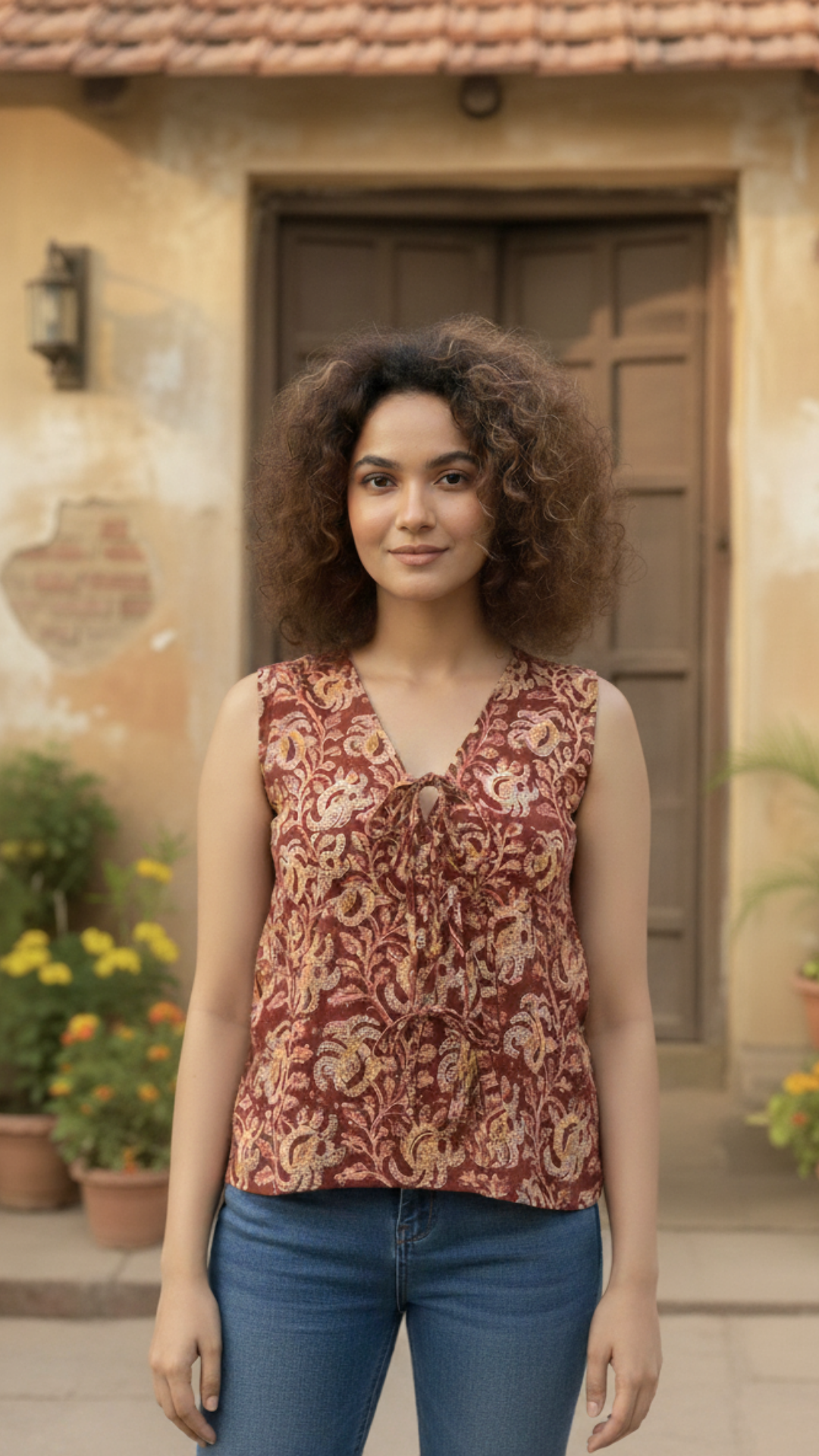 Elevate your everyday style with this elegant blue cotton block-printed top. Made from breathable cotton, it features a modern shirt-style design with a unique single button placed slightly to the left. The flattering V-neckline and sleeveless cut make it perfect for warm days and easy layering. Pair it effortlessly with skirts, denims, shorts, or pants for a chic and versatile look.